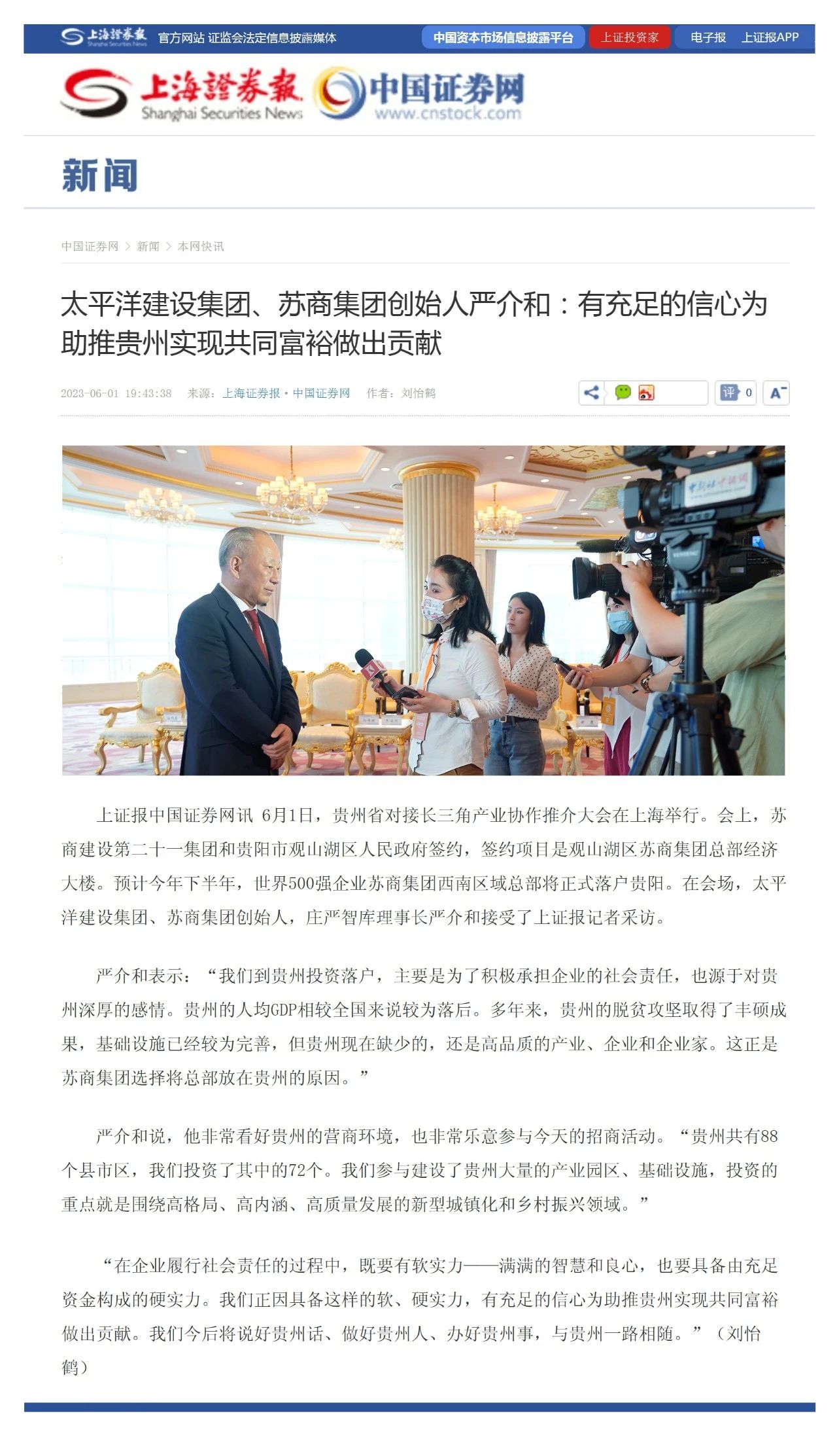 資訊:6月1日,貴州省對(duì)接長(zhǎng)三角產(chǎn)業(yè)協(xié)作推介大會(huì)在上海舉行。會(huì)上,蘇商建設(shè)第二十一集團(tuán)和貴陽市觀山湖區(qū)人民政府簽約,簽約項(xiàng)目是觀山湖區(qū)蘇商集團(tuán)總部經(jīng)濟(jì)大樓。預(yù)計(jì)今年下半年,世界500強(qiáng)企業(yè)蘇商集團(tuán)西南區(qū)域總部將正式落戶貴陽。在會(huì)場(chǎng),太平洋建設(shè)集團(tuán)、蘇商集團(tuán)創(chuàng)始人,莊嚴(yán)智庫理事長(zhǎng)嚴(yán)介和接受了上證報(bào)記者采訪。