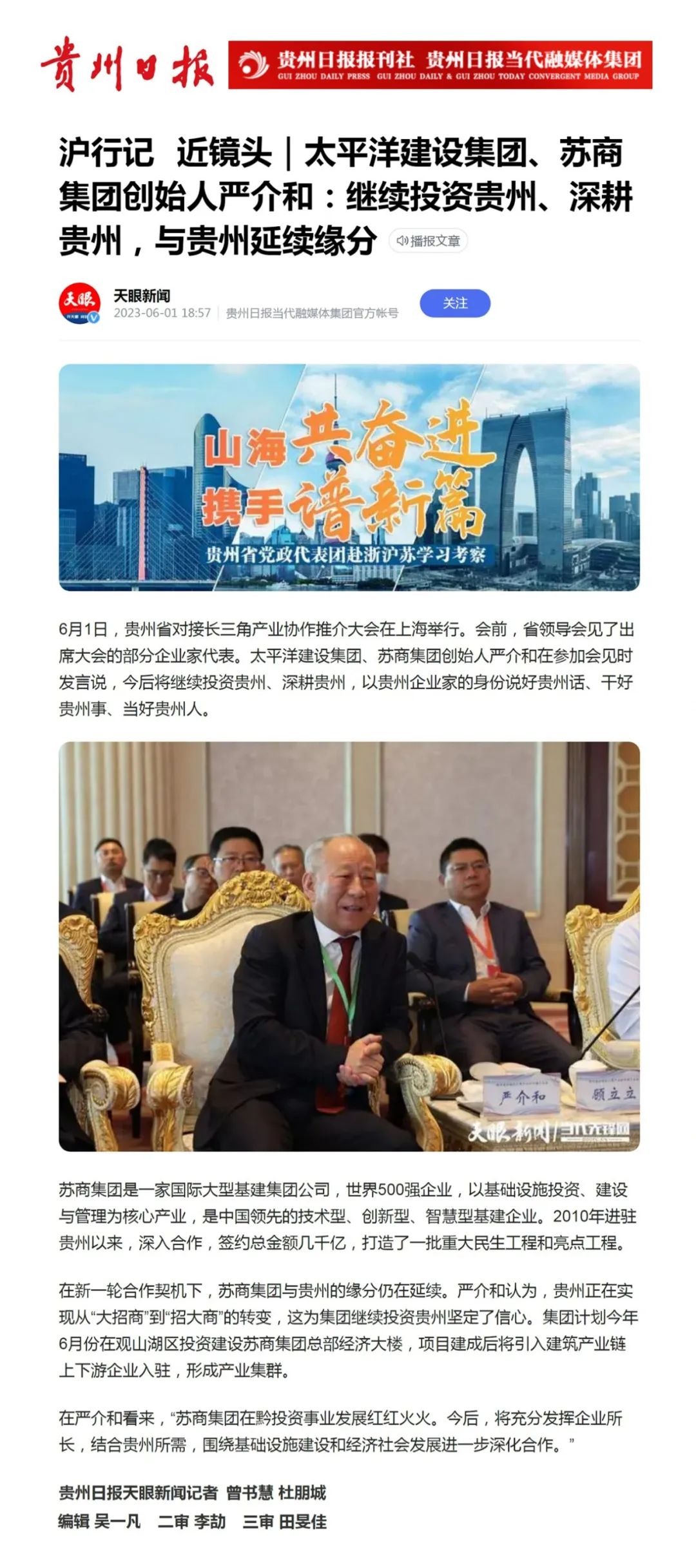 《貴州日報》天眼新聞——嚴介和:繼續(xù)投資貴州、深耕貴州,與貴州延續(xù)緣分