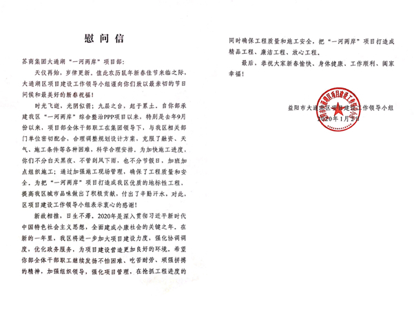 1月3日,蘇商第十建設(shè)集團(tuán)承建的湖南省益陽(yáng)市大通區(qū)“一河兩岸”綜合整治PPP項(xiàng)目收到當(dāng)?shù)貥I(yè)主單位發(fā)來(lái)的感謝信。