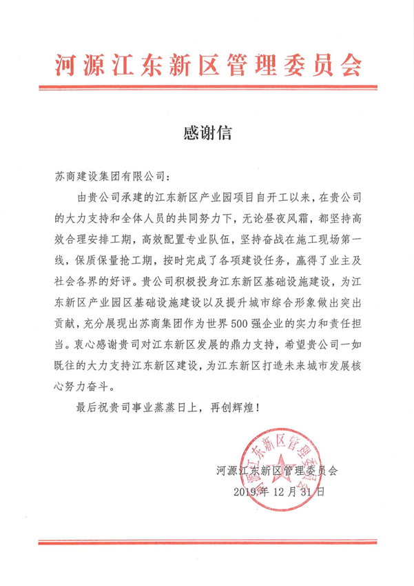 蘇商第六建設集團收到廣東河源江東新區(qū)管委會感謝信