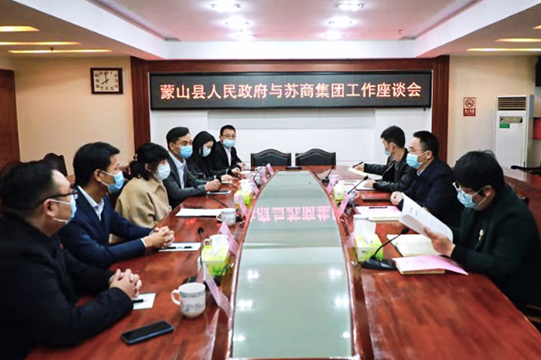 蘇商建設第十二集團董事局主席劉懷青、第二十五集團董事局主席盧政,蘇商建設副總裁兼經營中心總經理胡飛,第十二集團梧州項目總指揮陳俊、第二十五集團蒙山市場負責人劉憲;蒙山縣政府辦公室主任范萌參加座談。(文/圖 蘇商集團文品中心)