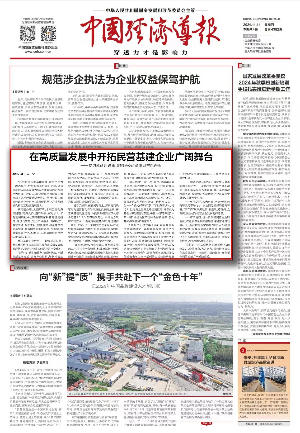 近期,國(guó)家發(fā)展改革委聯(lián)合中央統(tǒng)戰(zhàn)部、全國(guó)工商聯(lián)在中央社會(huì)主義學(xué)院舉辦新時(shí)代民營(yíng)經(jīng)濟(jì)人士培育賦能第三期培訓(xùn)班。蘇商集團(tuán)董事局主席嚴(yán)昕受邀參加培訓(xùn),并在期間就民營(yíng)經(jīng)濟(jì)高質(zhì)量發(fā)展、新質(zhì)生產(chǎn)力賦能傳統(tǒng)行業(yè)等話題接受相關(guān)媒體專訪。